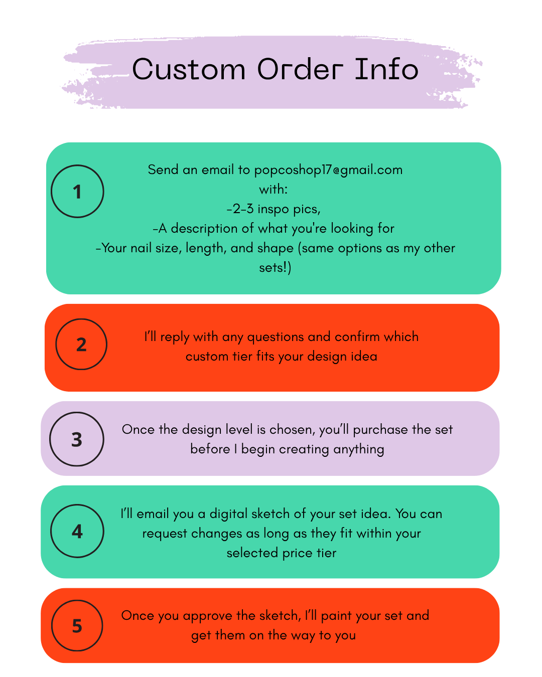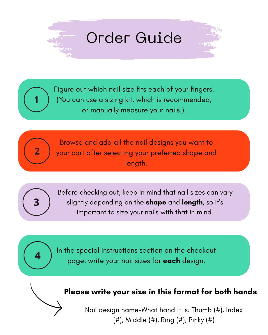 Each order will include the set of nails you ordered, a mini nail glue, a mini nail file, a wooden cuticle pusher, and an alcohol wipe. If your order includes multiple sets of nails, each set will come with the listed accessories.